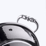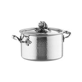 Crafted in clad stainless steel, an innovative material that combines the optimal heat conductivity of an aluminium core with the great ease of use of mirror-polished stainless steel. The first hand-hammered stainless steel cookware, for a beauty that lasts, this Opus Prima Soup pot also features a delicately decorated stainless steel handle, unique serial number, and is crowned with a hand-cast bronze finial in the shape of a pumpkin and gourd that is plated in silver by our partner silversmiths in Milan.