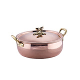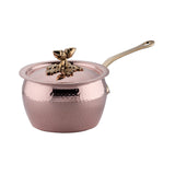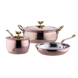 Crafted in solid copper for superior heat conductivity, hand-hammered and tin-lined by hand over fire so naturally low-stick. The riveted handles are cast of solid bronze, and the lids are crowned by Ruffoni's signature acorns with their leaves. This set is designed to be displayed proudly in the kitchen, inspire creativity while cooking, and be shared joyfully at the table with family and guests.