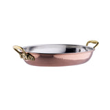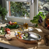Crafted in solid copper for superior heat conductivity, hand-hammered and tin-lined by hand over fire so naturally low-stick. The riveted handles, cast of solid bronze, are adorned by acorns and leaves: beautiful finishes make this piece ideal for oven-to-table dining and entertaining.